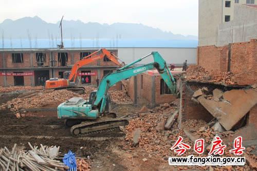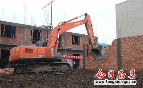 圖為縣執(zhí)法機(jī)關(guān)組織機(jī)械對違法建筑進(jìn)行拆除