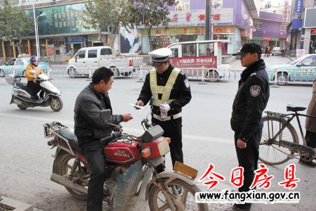 隨著我縣摩托車數(shù)量的與日俱增,交通事故頻發(fā),我縣道路交通事故中67.7%與摩托車有關(guān)。圖為縣交警執(zhí)法大隊警員對未帶安全頭盔的摩托車車主進行處罰。 (劉臣 攝)