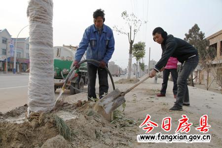 8日,房陵大道西延工程高碑4組段道路旁,工人為新補(bǔ)植的大香樟樹澆水、培土、覆膜。據(jù)了解,為配合“三城聯(lián)創(chuàng)”,縣林業(yè)局調(diào)集100余株胸徑20cm的香樟樹進(jìn)行補(bǔ)栽,大力營(yíng)建道路生態(tài)林景觀,并組織專班人用塑料薄膜、草繩對(duì)道路景觀樹樹干進(jìn)行包裹,為新栽植的道路景觀樹澆水保墑、覆膜保溫,確保大樹安全過冬。