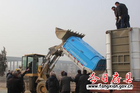 圖為群眾正在將此次捐贈的垃圾中轉(zhuǎn)箱卸車