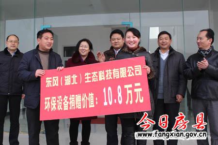 圖為東汽(湖北)生態(tài)科技有限公司總經(jīng)理袁憲華與軍店鎮(zhèn)書記丁選清進(jìn)行捐贈環(huán)保設(shè)備專項資金移交儀式