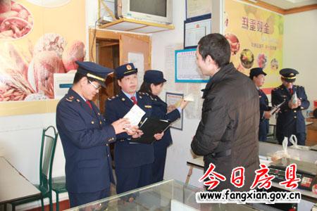 圖為工商執(zhí)法人員正在檢查一副食店食品登記臺賬