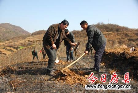 圖為村民們忙碌的栽種著核桃苗