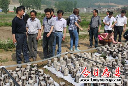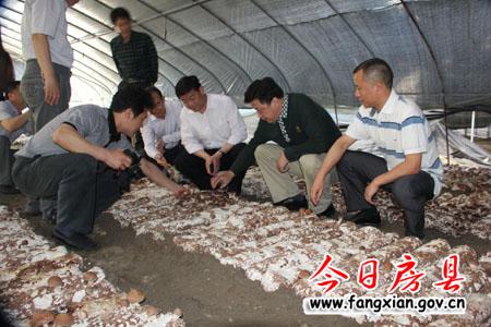 圖為邊銀丙一行在湖北鹽業(yè)集團(tuán)福綠源食用菌科技公司香菇生產(chǎn)基地察看香菇生產(chǎn)情況