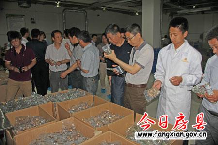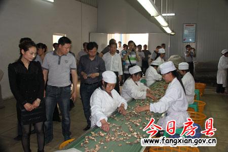 圖為與會(huì)專(zhuān)家、會(huì)員代表在興農(nóng)食用菌專(zhuān)業(yè)合作社地理標(biāo)志產(chǎn)品加工基地參觀