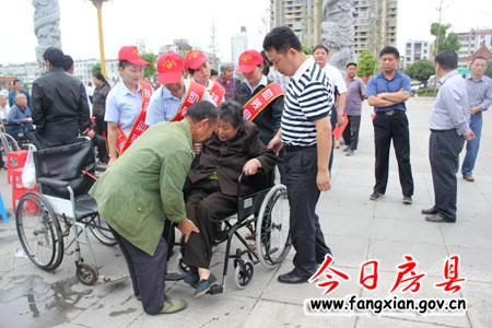 圖為張永平正幫困難殘疾人坐上贈送的輪椅
