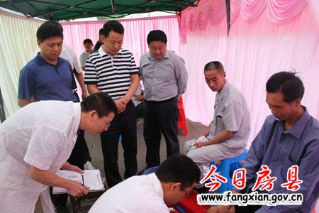 圖為董文斌(左一)、張永平(左二)、陳德漢(右三)察看醫生為殘疾人安裝假肢情況
