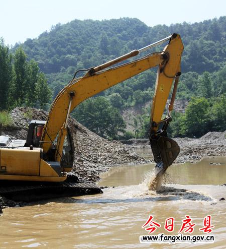 工人正在清理影響河道行洪砂石