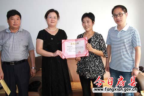 縣文明委副主任、縣委常委、宣傳部部長徐錦鳳(左二)授給伍昌云(右二)“房縣最美鄉(xiāng)村教師”榮譽證書