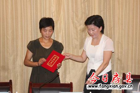 市婦聯(lián)主席王靜(左二)代表市婦聯(lián)為伍昌云(左一)頒發(fā)十堰市“三八紅旗手”榮譽(yù)證書(shū)