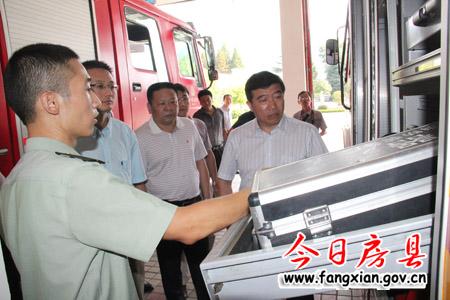 圖為檢查組一行在縣消防大隊了解我縣應(yīng)急救援設(shè)施配備情況